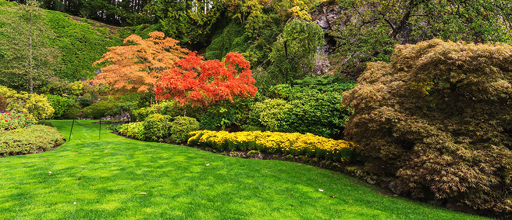 Think evergreen, ground-cover, and shrubs over seasonal bedding — less replanting, more consistency, fewer chores.