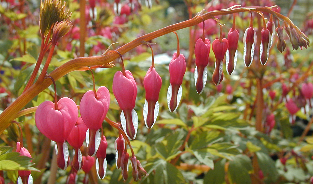 Dicentra spectabilis, commonly known as bleeding heart, is a perennial plant admired for its graceful, arching stems adorned with heart-shaped, pink-and-white flowers in late spring to early summer. Its finely divided, fern-like foliage adds delicate texture to shaded borders and woodland gardens. Preferring cool, moist, well-drained soil and partial to full shade, dicentra is low-maintenance and often naturalizes in suitable conditions. The plant’s unique, romantic blooms and elegant form make it a standout for adding charm and softness to shaded garden areas.