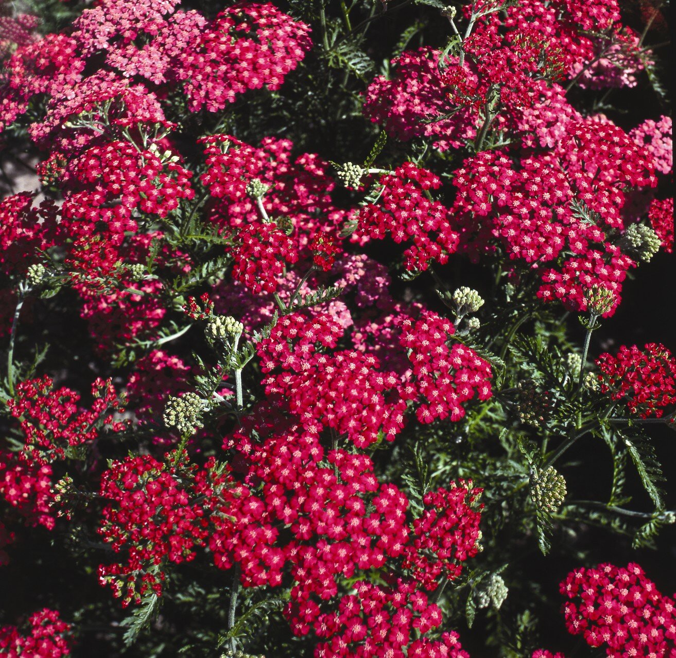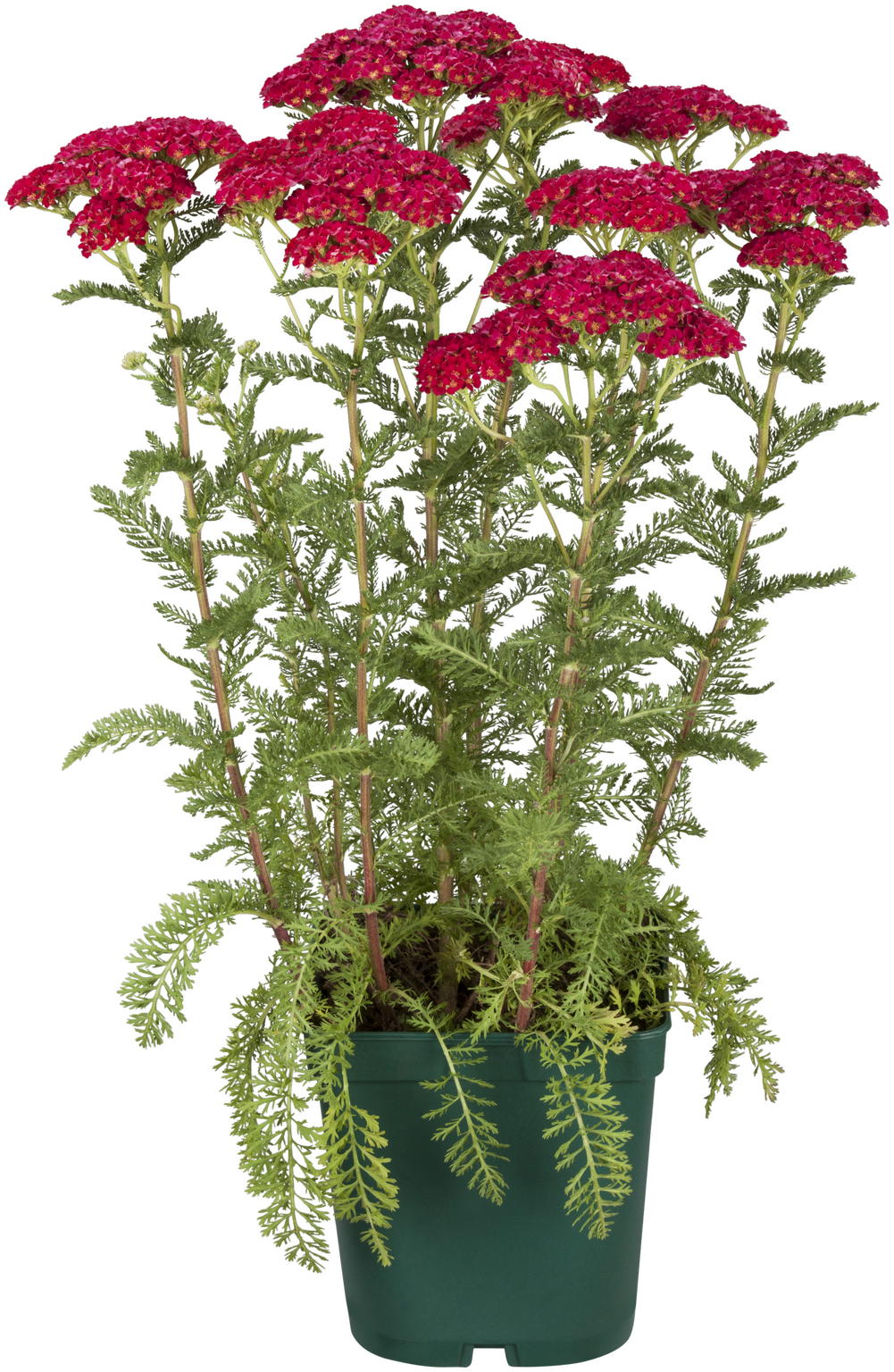 From early to midsummer (June to August), clusters of deep cherry-red, flat-topped flower heads appear on strong, upright stems. These long-lasting blooms add vibrant colour and contrast well with silver or blue foliage.