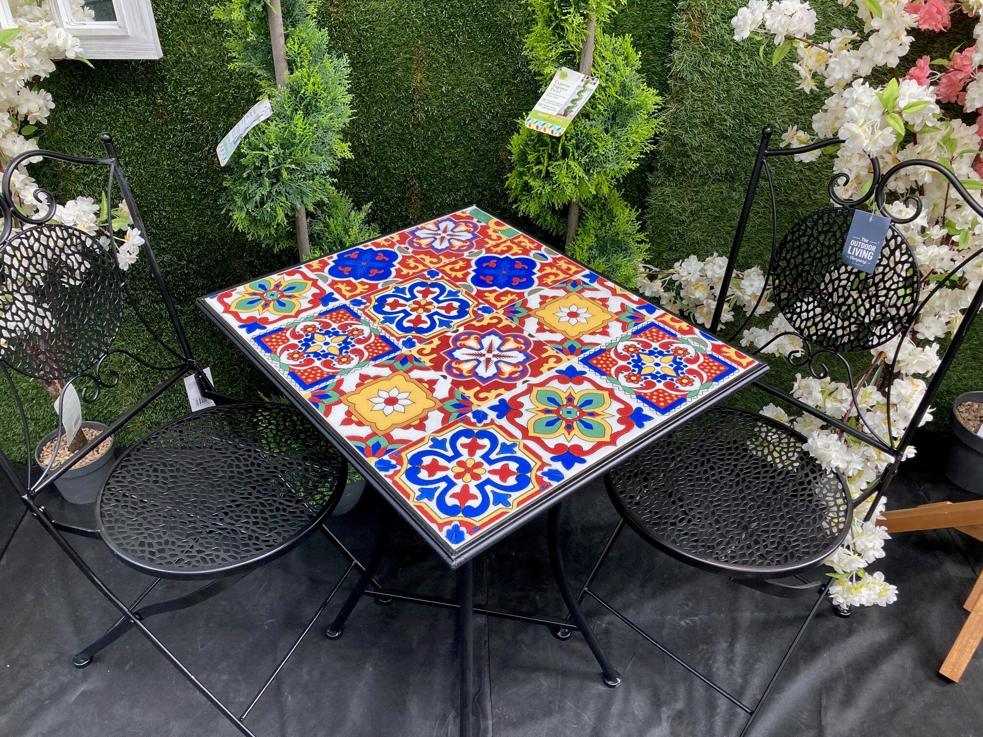 Set consists of a rectangular table and 2 folding chairs. The ceramic top table has an attractive, colourful pattern. 60cm width x 50cm depth x 75cm height table. Flat packed ready for self assembly.