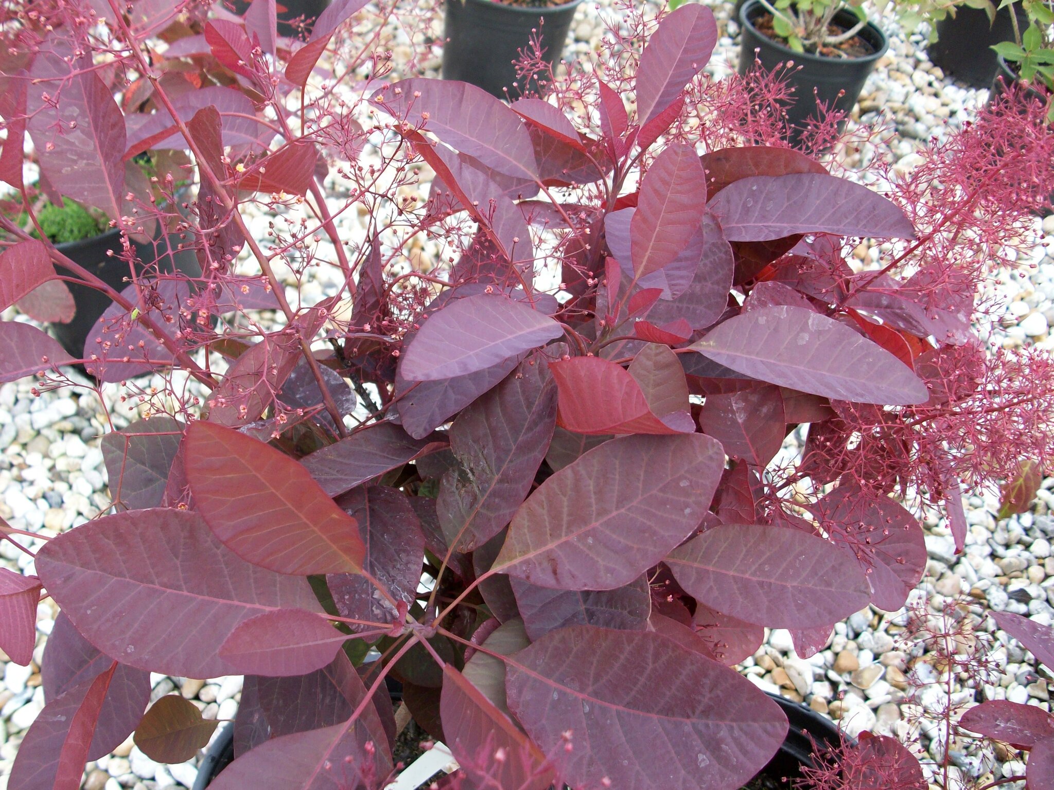 Summer: Produces large, smoky-pink flower panicles that give a distinctive “smoke-like” effect; foliage remains bold and deep red to purple.