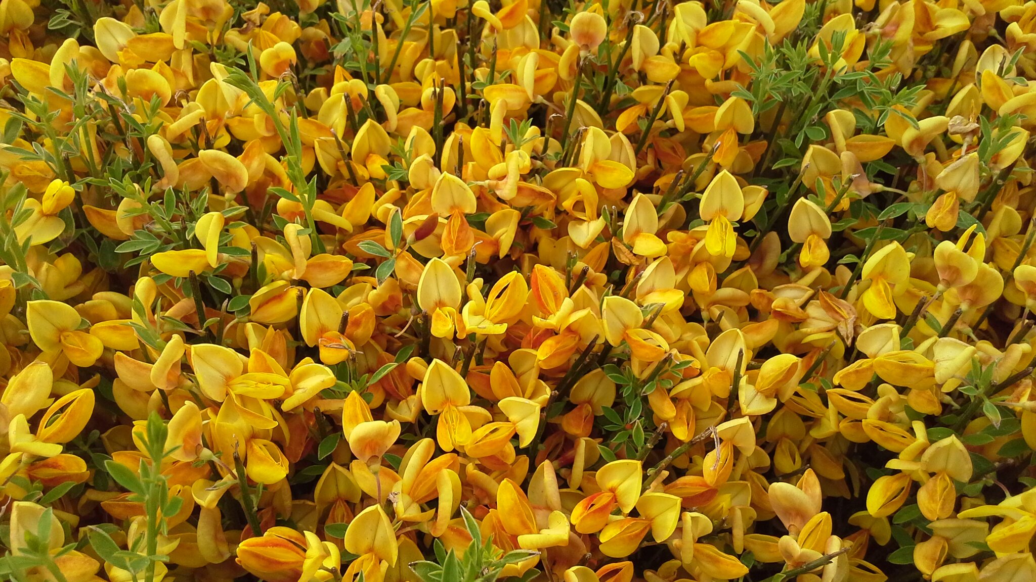 Spring: Spectacular display of apricot-orange and yellow pea-like flowers, covering the arching green stems.