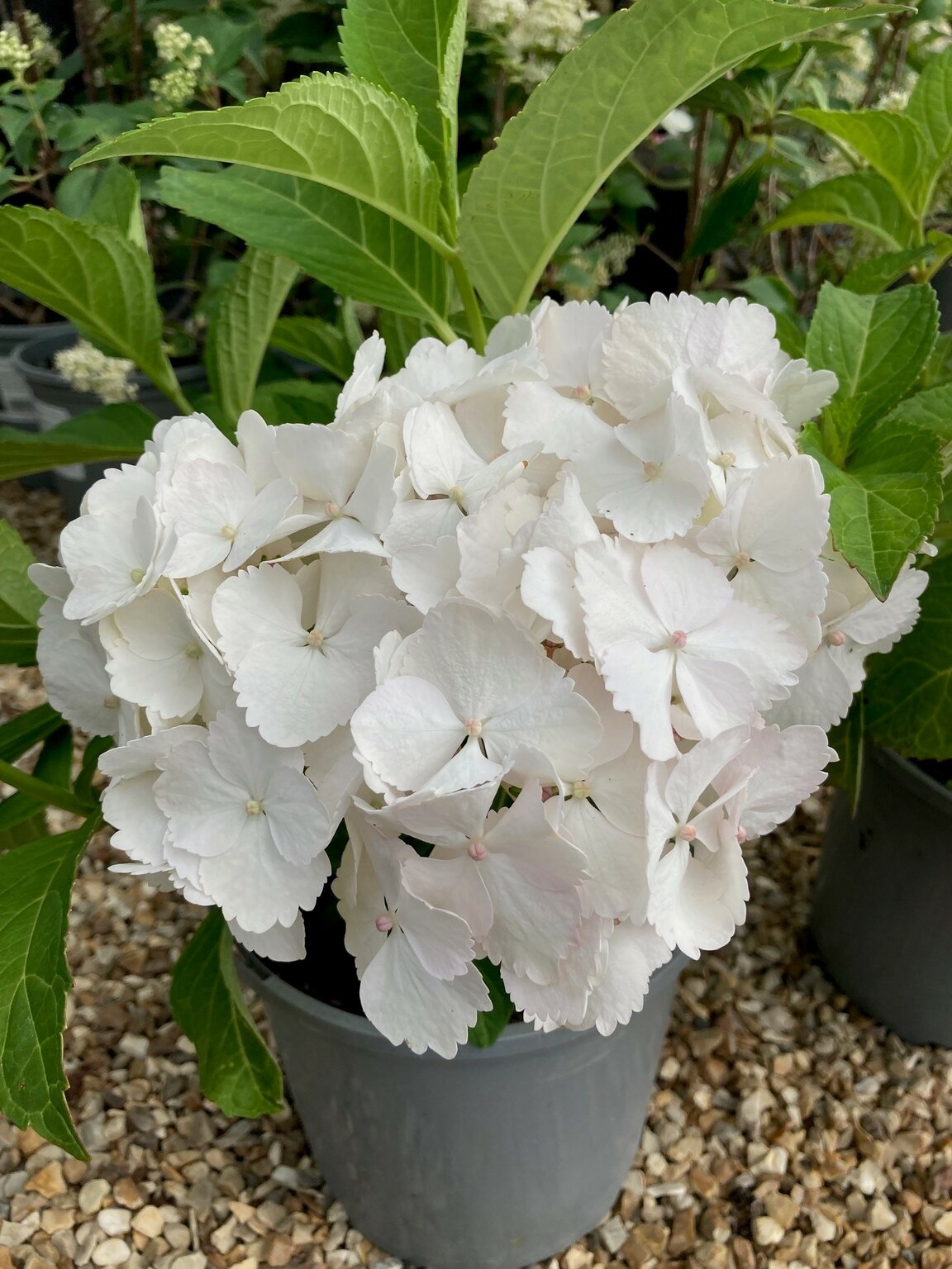 Large, rounded mop-head flowers open from June to August, starting pure white, sometimes developing pink or greenish tints as they age.