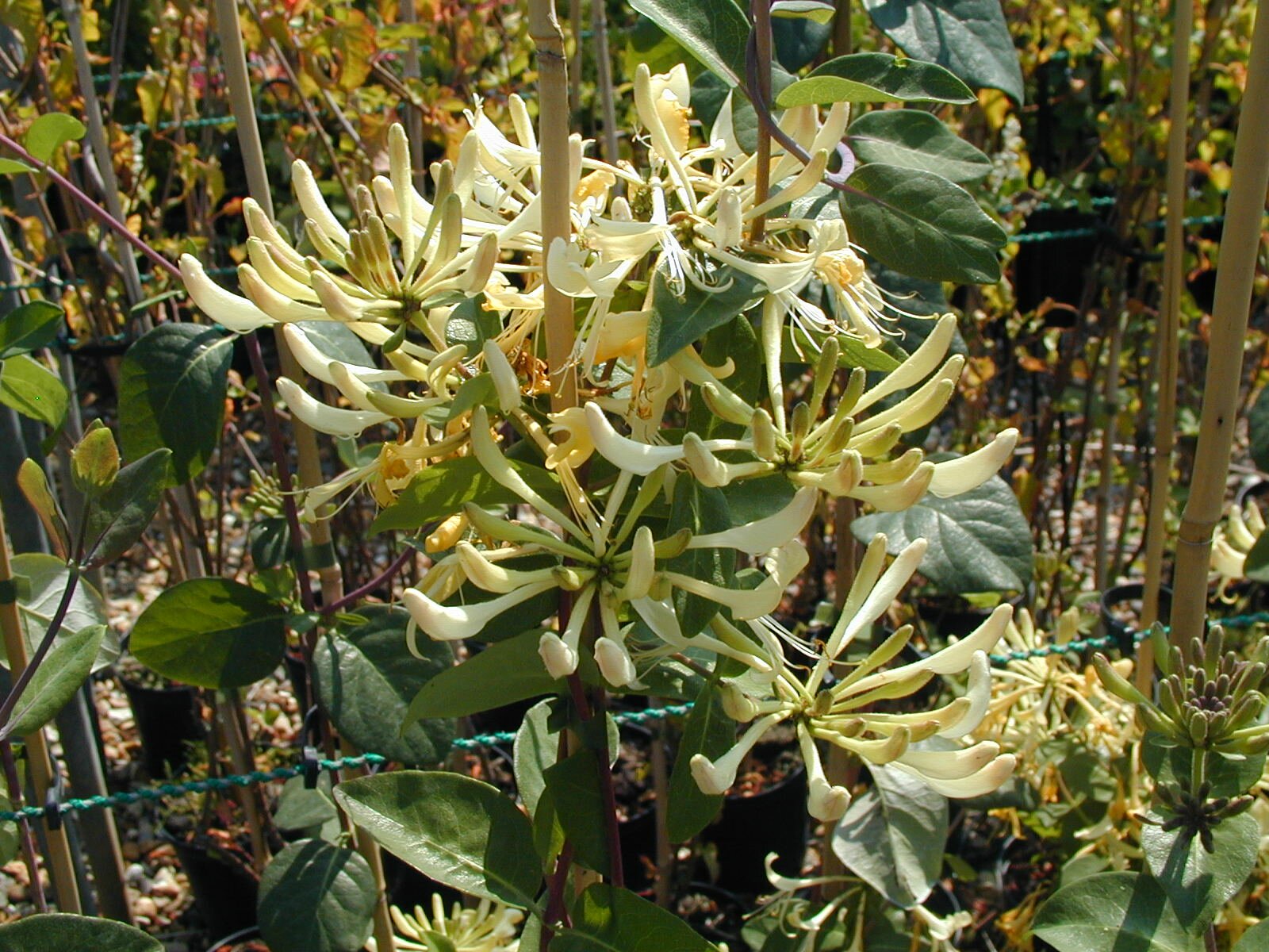 Japanese Honeysuckle'. A twining climber, with mid-green leaves and very fragrant white flowers that turn yellow from June to Sept. Ht: 7m Vigorous. Plant in full sun or part shade. Likes most soil types.