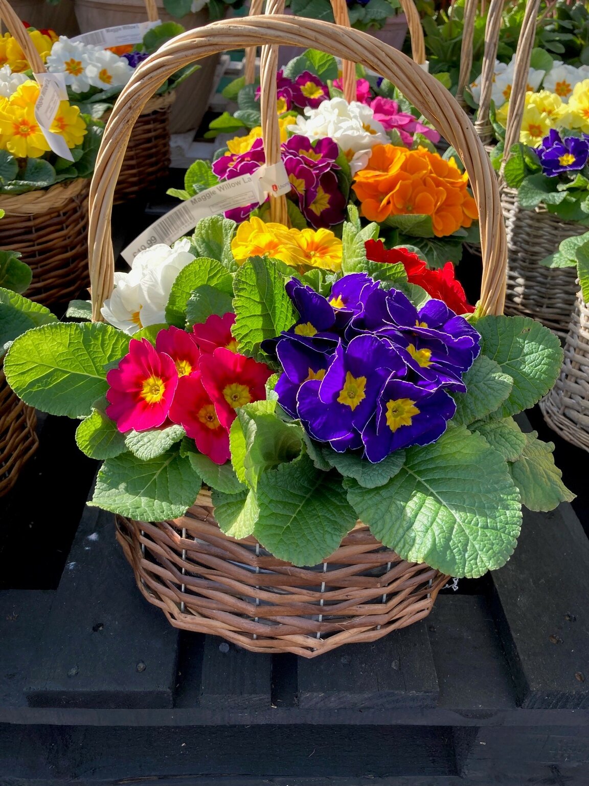 A wicker basket with handle, planted with 5 mixed primroses. 26cm in diameter. A great gift idea for Mother's Day