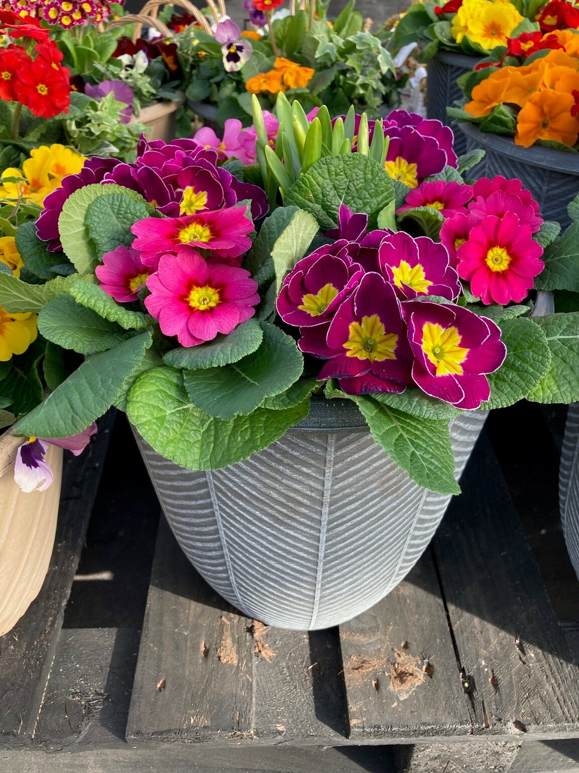 This larger plented mixed tub consists of 5 mixed primroses and a centre piece Narcissi. 30cm in diameter. Ideal Mother's Day Gift idea!