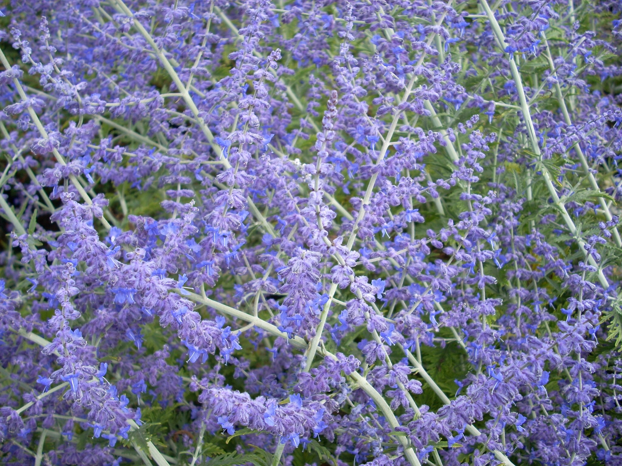 Tall, upright stems with clouds of lavender-blue flowers from mid to late summer. Aromatic, finely divided silver-grey foliage. -