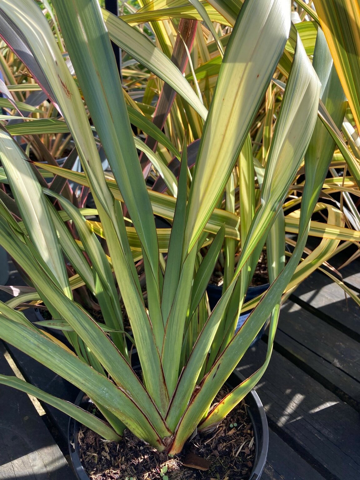 Bold, arching evergreen leaves emerge in green with broad yellow stripes. -