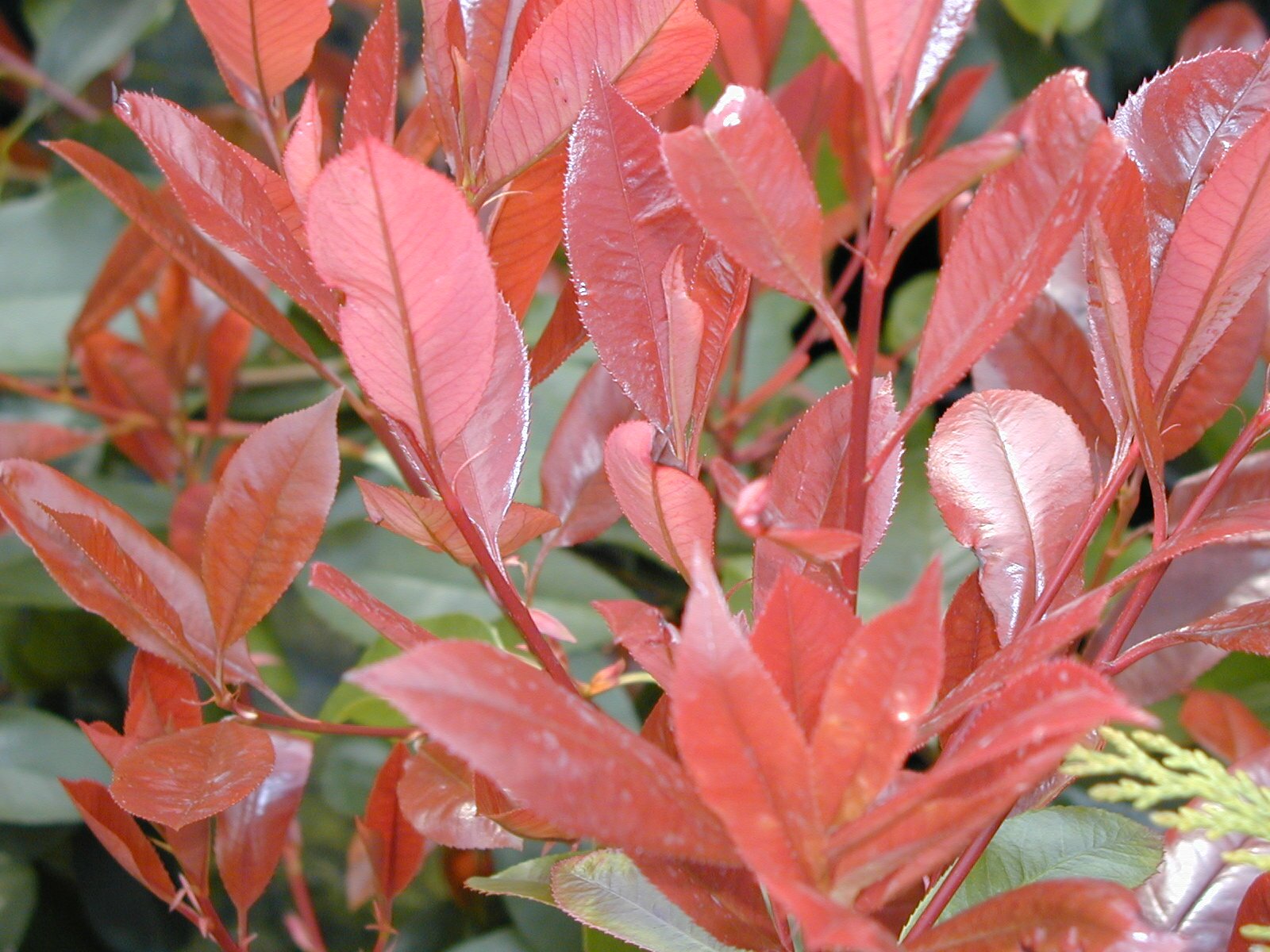 An upright, evergreen shrub with dark green leaves that are long lasting bright red when young. In Spring it produces panicles of small white flowers, sometimes followed by fruit. Can be used to form a natural hedge line. This larger sized pot is currently around 3ft in height.