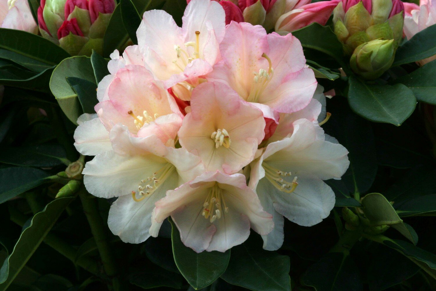 A low growing evergreen hybrid variety that has pink buds that open to a soft creamy yellow. Flowering throughout May it displays a mass of beautiful flowers. Approx 1m x 1m
