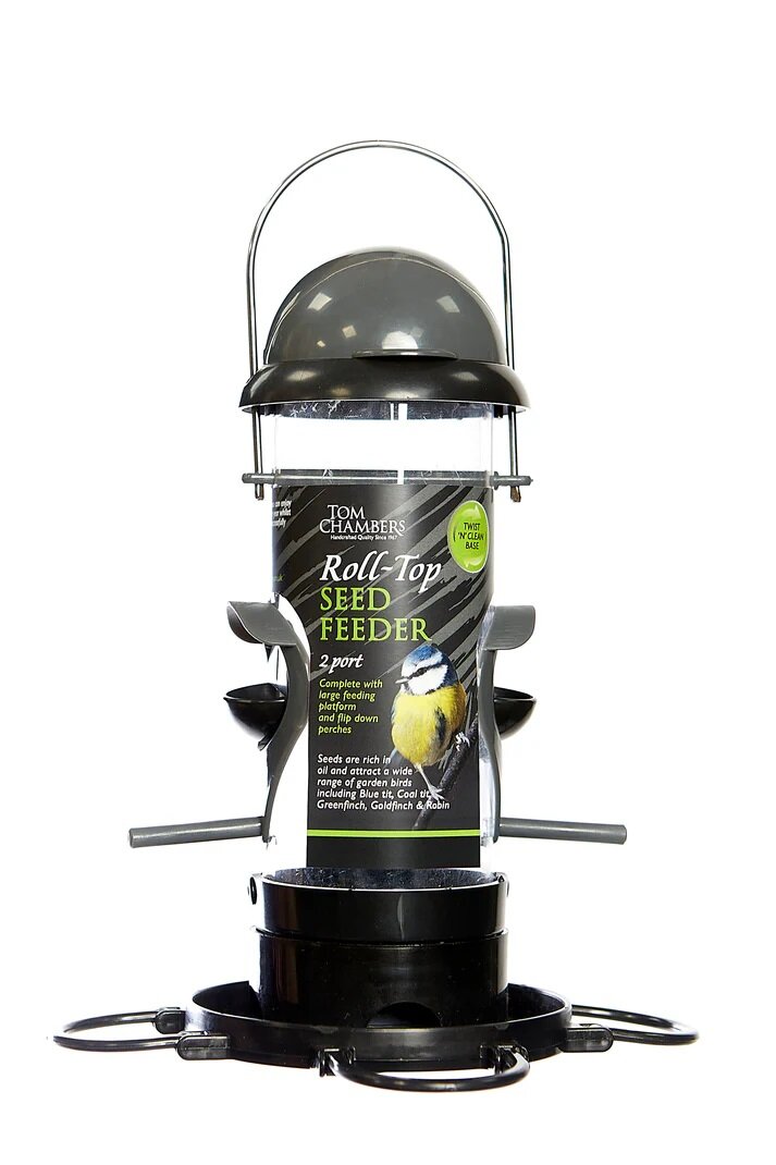 2 port seed feeder complete with large feeding platform and flip down perches. Roll top flips open for an easy re-fill. Approx 22cm in height