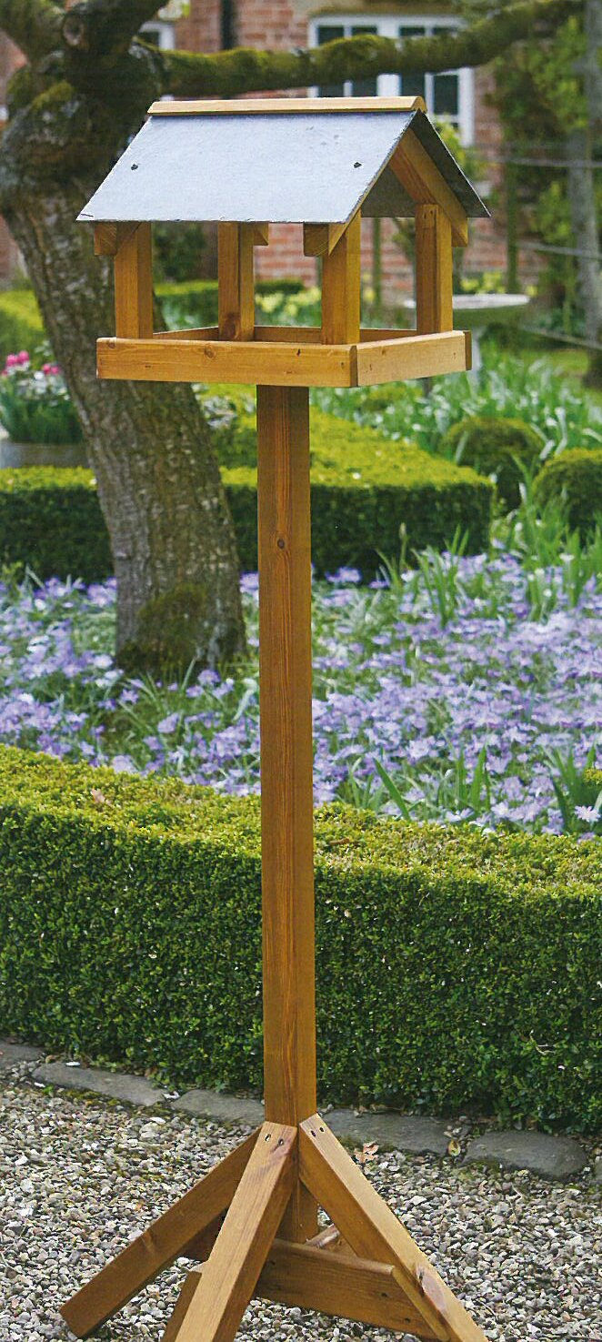 Handcrafted from sustainable timber this traditional slate roof bird table will feed a variety of foods to garden birds. FSC certified timber. Height 145cm