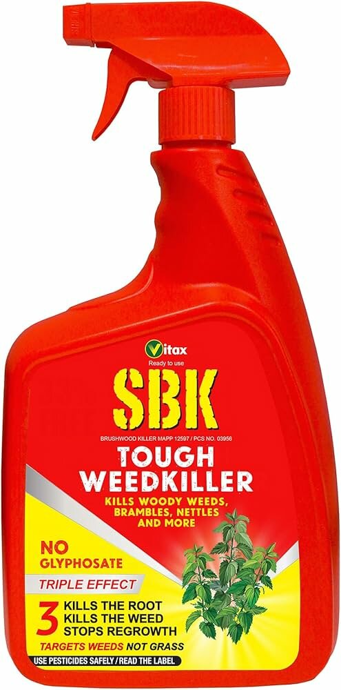 Fast and convenient, SBK Tough Weedkiller can be used on brambles, thistles, nettles and docks. Kills weeds and not grass, SBK Brushwood Killer ready-to-use spray. Apply from May to October when soil is moist or if using on woody weeds, apply June to August. SBK Brushwood Killer RTU can also be used for treating tree stumps during autumn and winter.