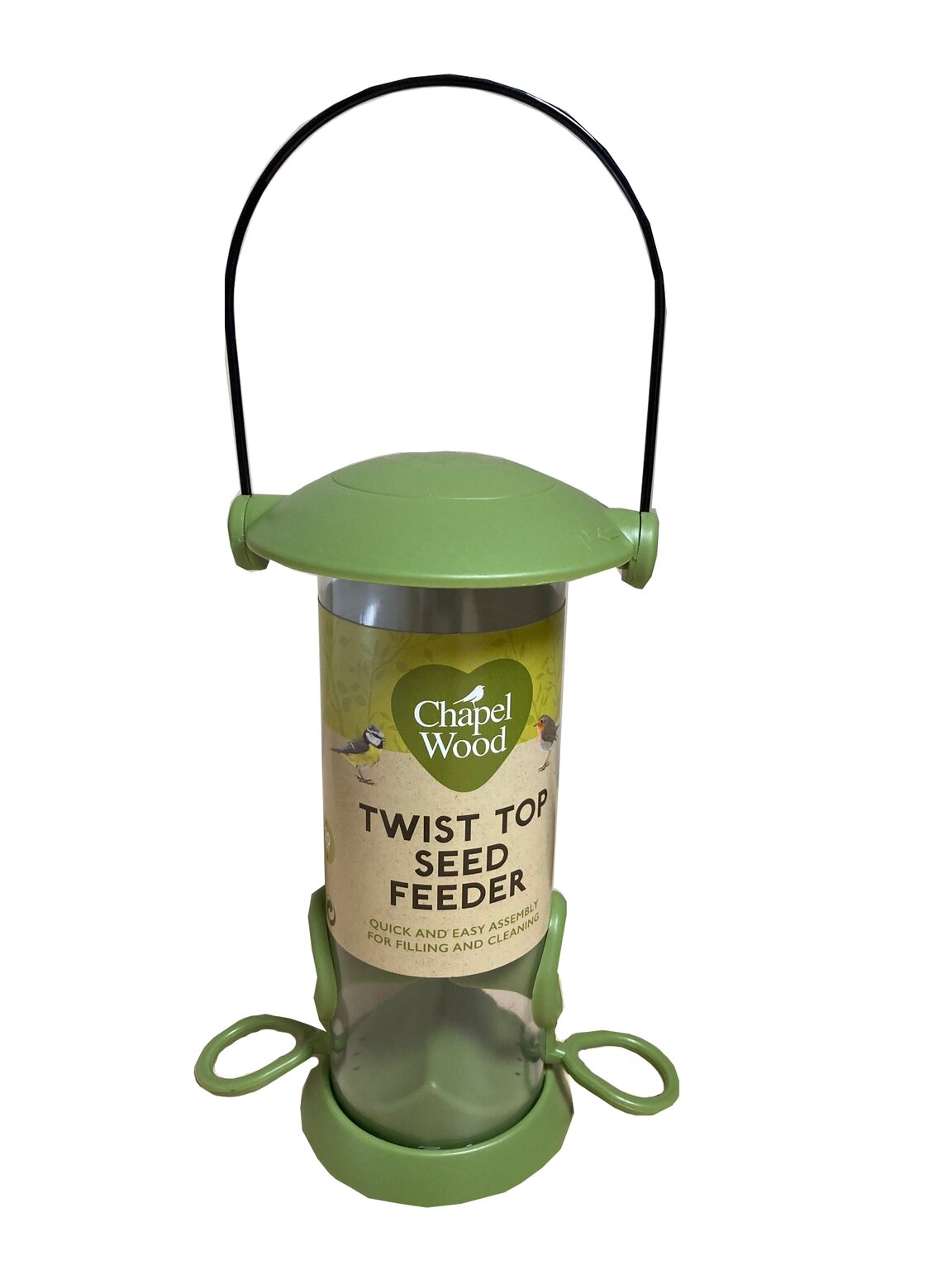 Twist top hanging seed feeder for quick & easy filling of bird seed. 20cm in height, holds 300g of feed.
