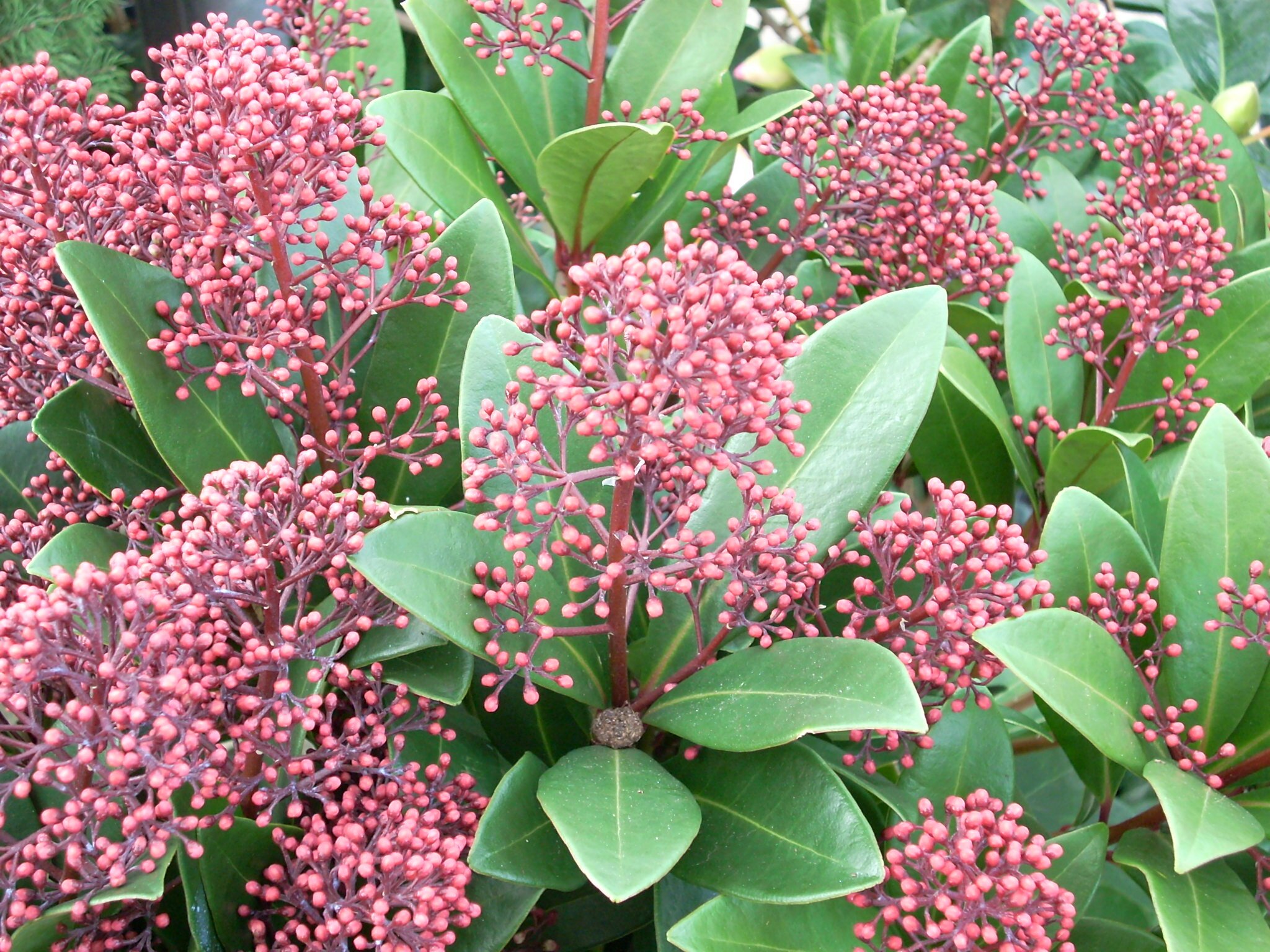A male evergreen shrub with shiny dark green leaves, margined red. Fragrant white flowers open from dark red buds in Spring. Plant as a pollinator for female Skimmia. Ht:1m Sp:1m Grow in shade in neutral to acid soil.